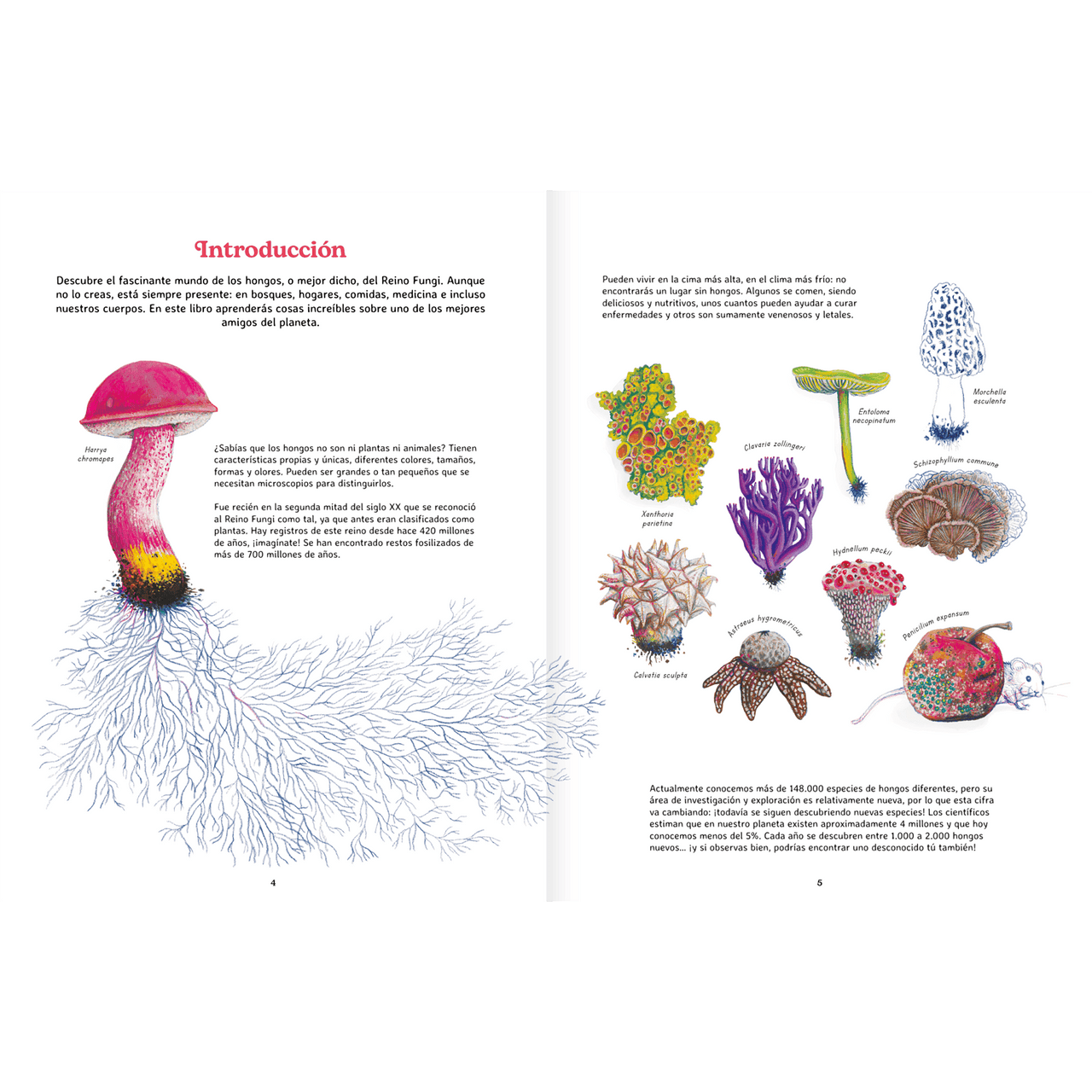 El texto guía a los lectores a través de la estructura, diversidad y funciones de los hongos, desde sus raíces subterráneas hasta sus misteriosas formas sobre la tierra. Las bellas ilustraciones dan vida a cada página, transportando a los lectores a un mundo de colores y detalles fascinantes. Con información relevante y actual sobre la importancia ecológica y práctica de los hongos, este libro es una herramienta invaluable para cualquier persona interesada en la ciencia, la ecología y la aventura. Es muy importante aprender más sobre este reino que está tan entrelazado con la vida y del que sabemos tan poco.