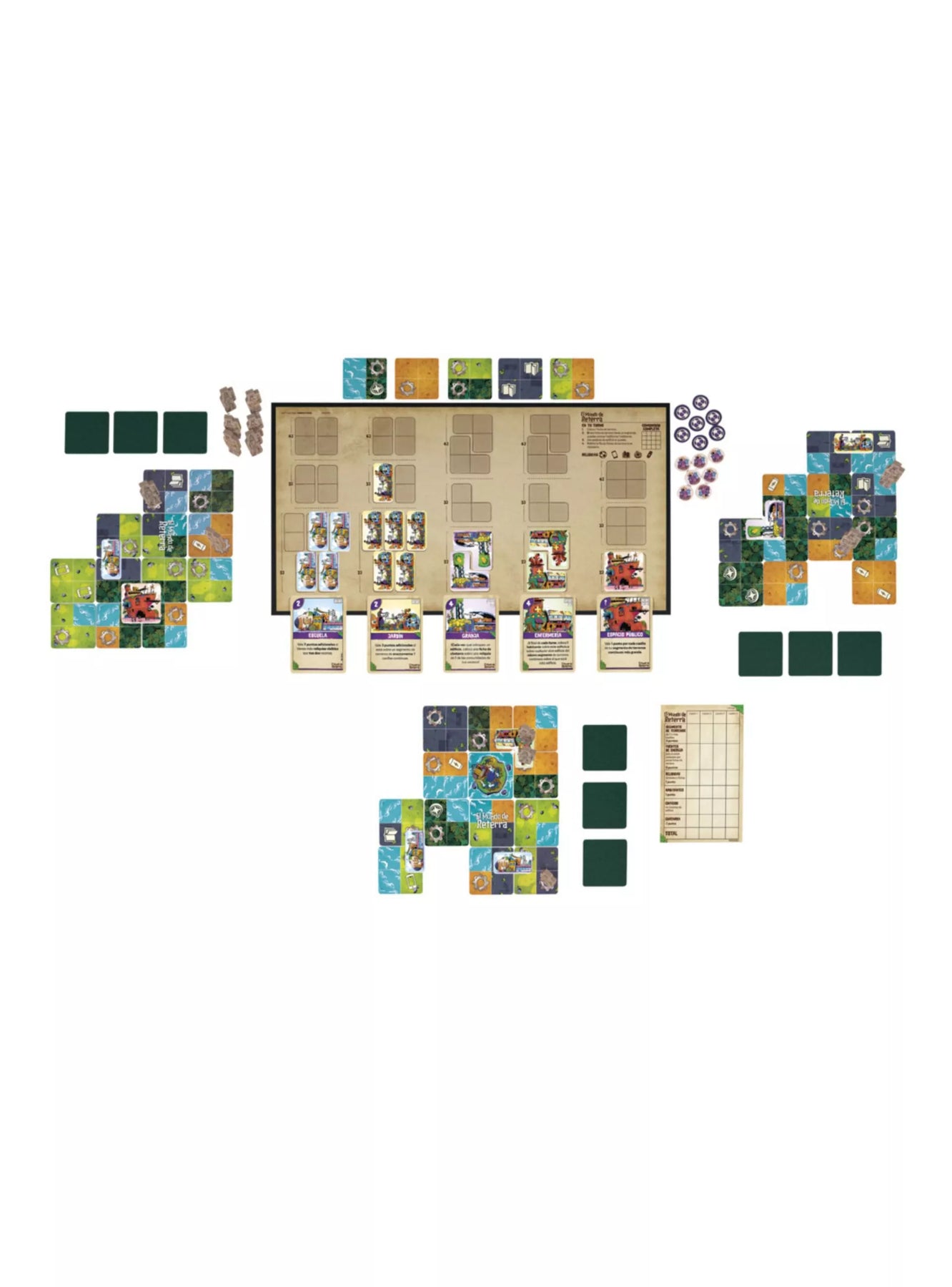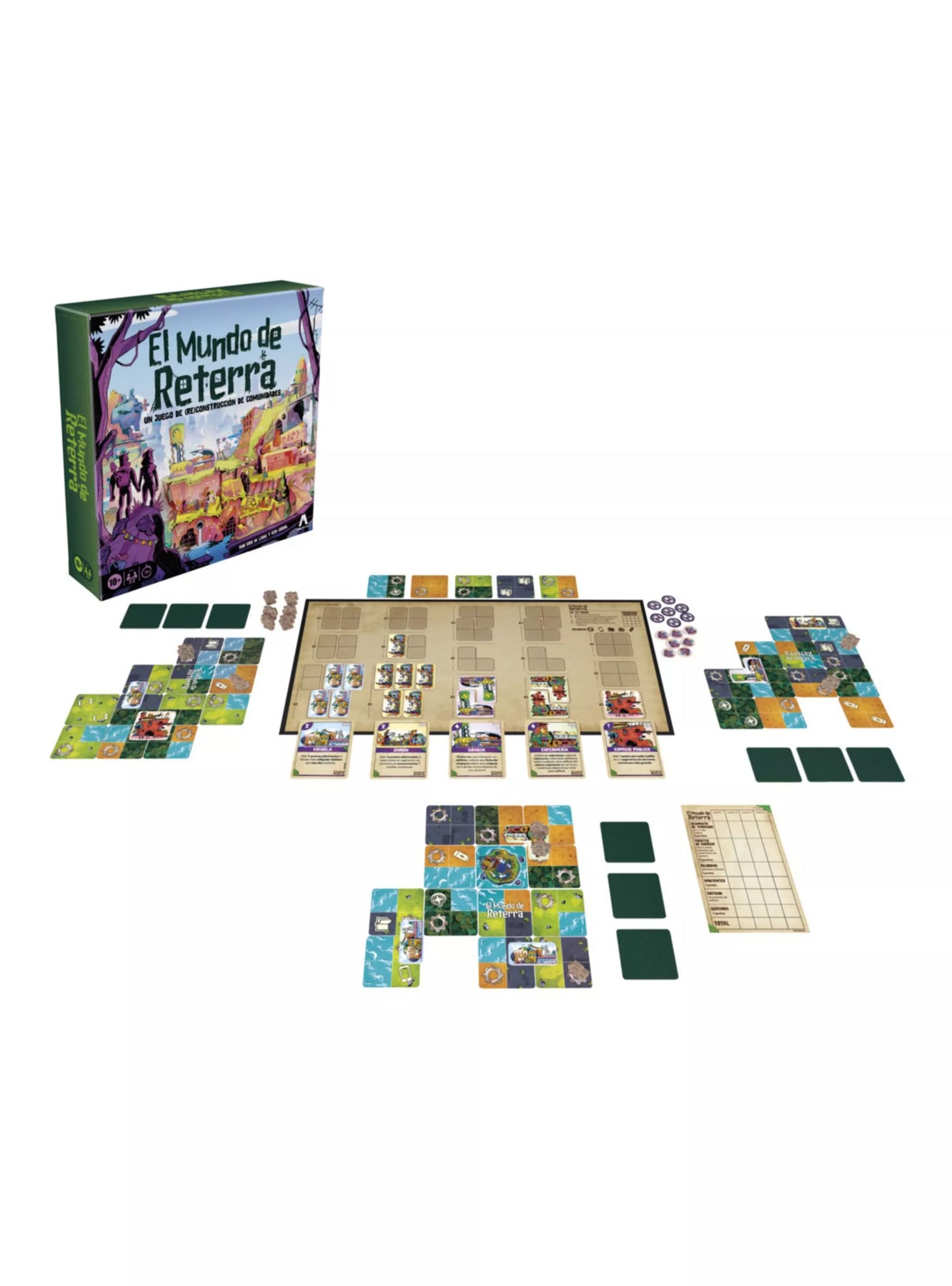 El juego Life in Reterra es un juego de (re)construcción de comunidades! En un futuro no tan lejano, el mundo tal como lo conocemos no es más que un gran recuerdo. Aunque ha cambiado mucho, también lo hemos hecho nosotros, y usamos cualquier cosa que encontremos para crear un nuevo estilo de vida. ¡Cada jugador deberá construir su propia comunidad! Primero, deberá elegir uno de los 3 sets temáticos de construcción incluidos. A continuación, deberá turnarse con el resto colocando fichas que representan diversos terrenos que luego deberá completar con construcciones y habitantes para construir una comunidad. Cuanto más próspera sea la comunidad de un jugador, más puntos ganará. Las tarjetas de construcción desbloquean poderes que ayudan a los jugadores a ganar puntos. Interactúa con otros jugadores y, quizás, hasta puedas obstaculizar su progreso.
