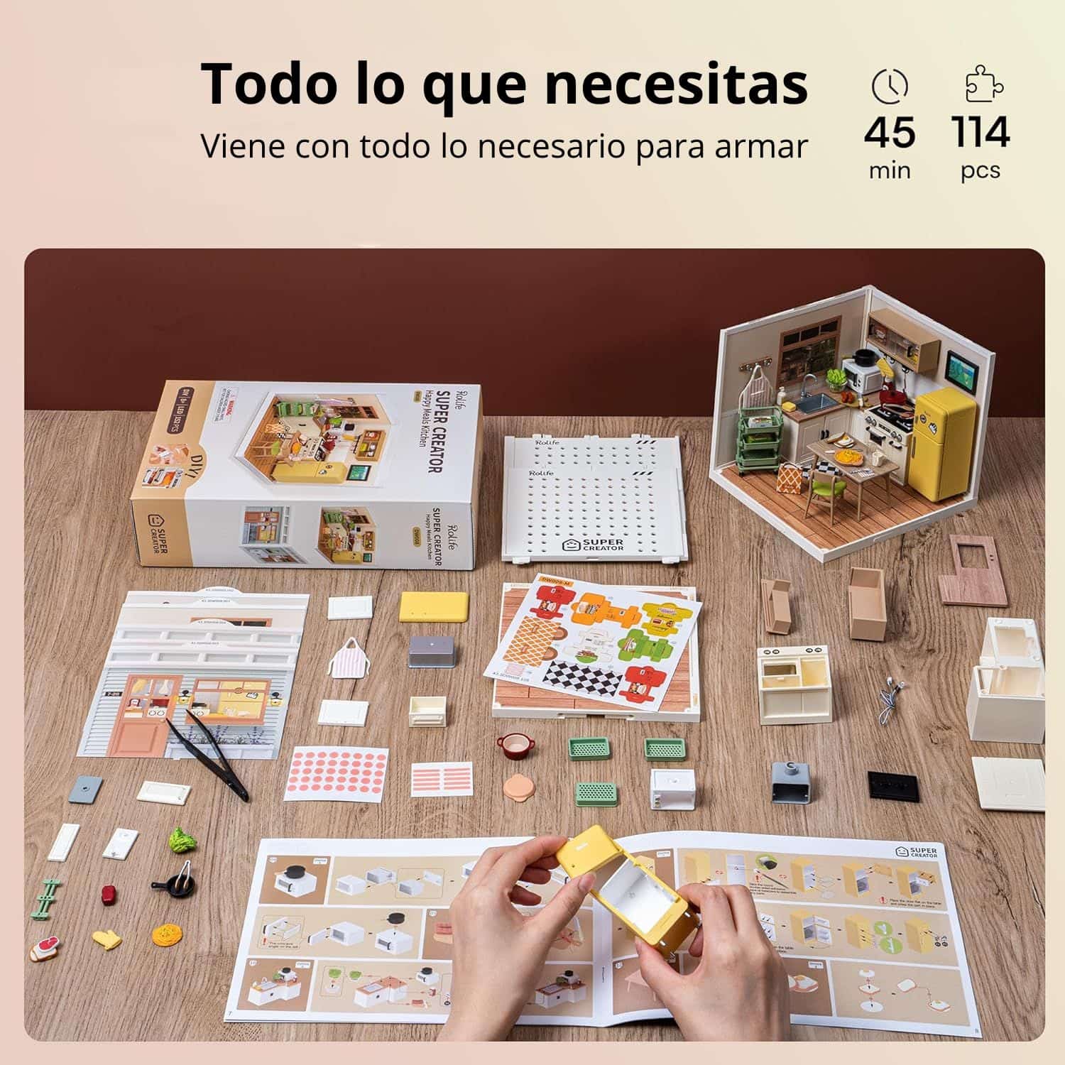 Esta Casa en Miniatura de Rolife es una pieza decorativa que recrea la escena de una Cocina. Para armar este kit, se prensan piezas de rompecabezas y se pegan objetos ya hechos, como el delantal, los platos de comida y las ollas. Contiene instrucciones coloridas, cada paso tiene imágenes para mostrar cómo ensamblarlo.