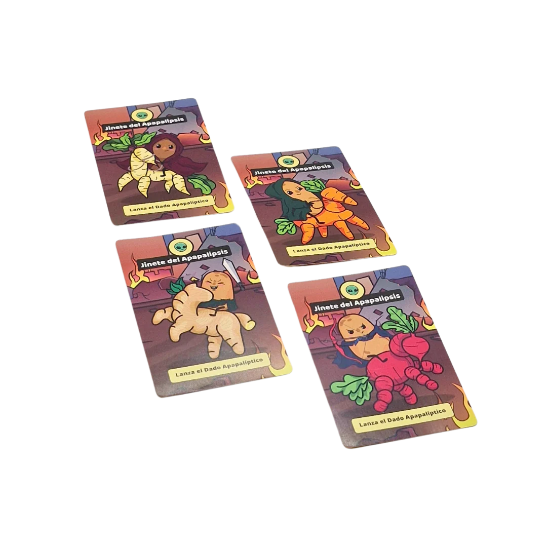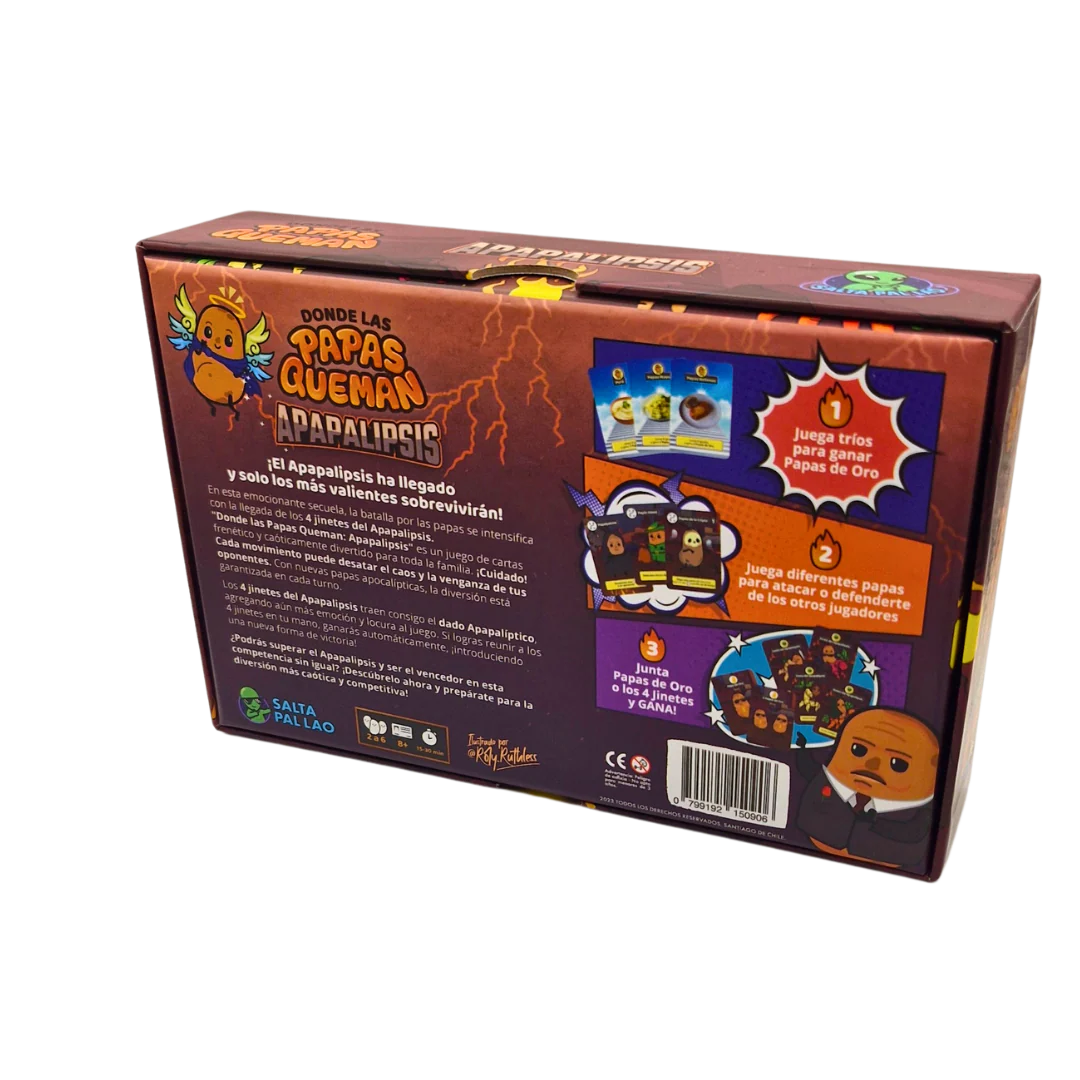 ¡El Apapalipsis ha llegado, y solo los más valientes sobrevivirán! En esta emocionante secuela, la batalla por las papas se intensifica con la llegada de los 4 Jinetes del Apapalipsis, quienes traen consigo el Dado Apapalíptico, agregando aún más emoción y locura al juego. Además de reuniendo las Papas de Oro, ¡Junta en tu mano los 4 jinetes y gana automáticamente!